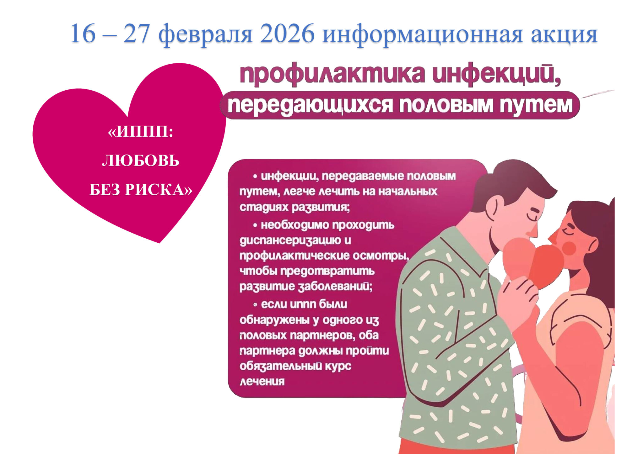 С 16 по 27 февраля 2026 года среди населения Гродненской области проходит информационная акция «ИППП: любовь без риска». 19.02.2026 Читать